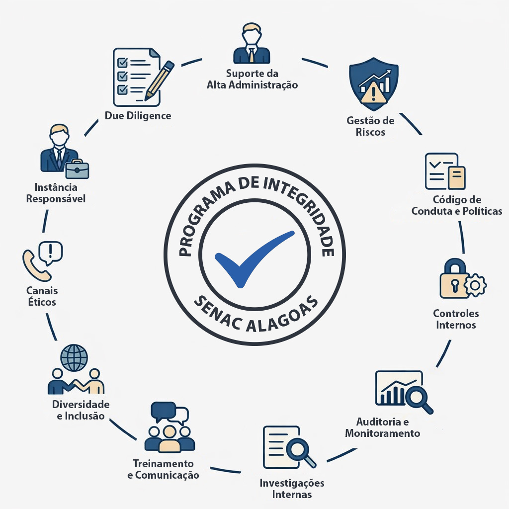 Em constante evolução, o Programa de Integridade do Senac Alagoas sustenta-se no comprometimento da Alta Administração e foi concebido a partir da observância dos normativos vigentes, das boas práticas de governança e integridade adotadas no mercado e das especificidades institucionais do Senac. Nesse contexto, o Programa estrutura-se a partir dos seguintes pilares: